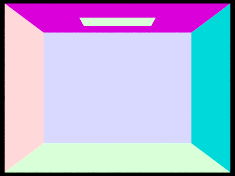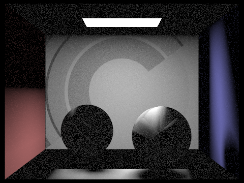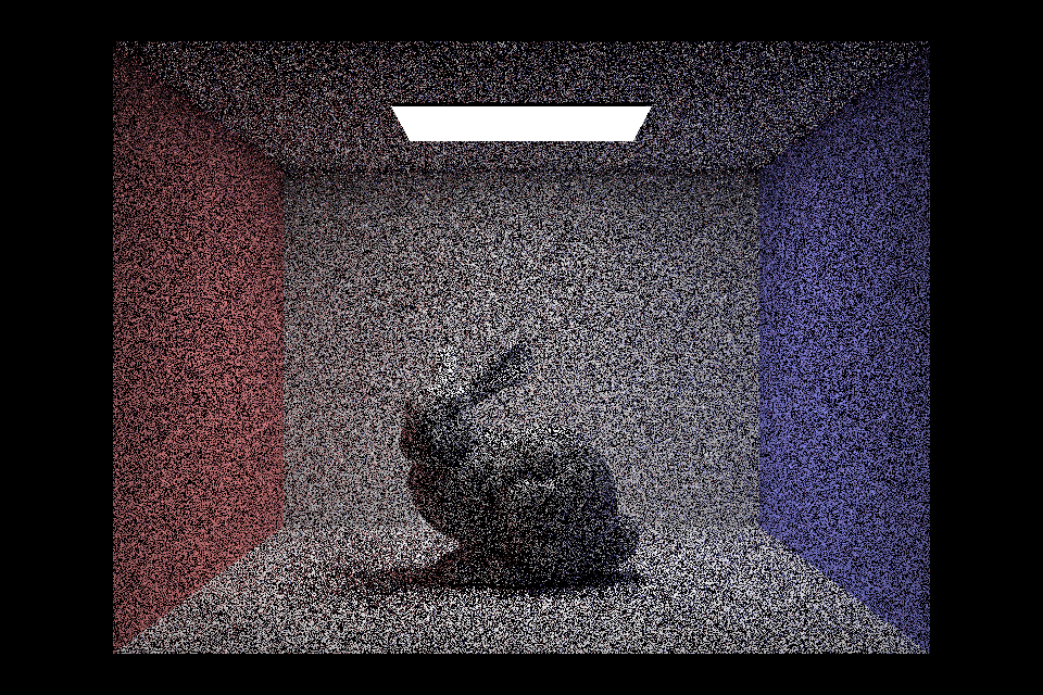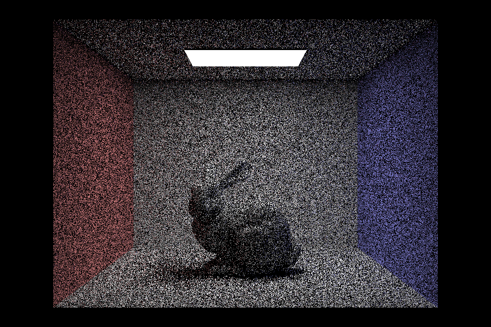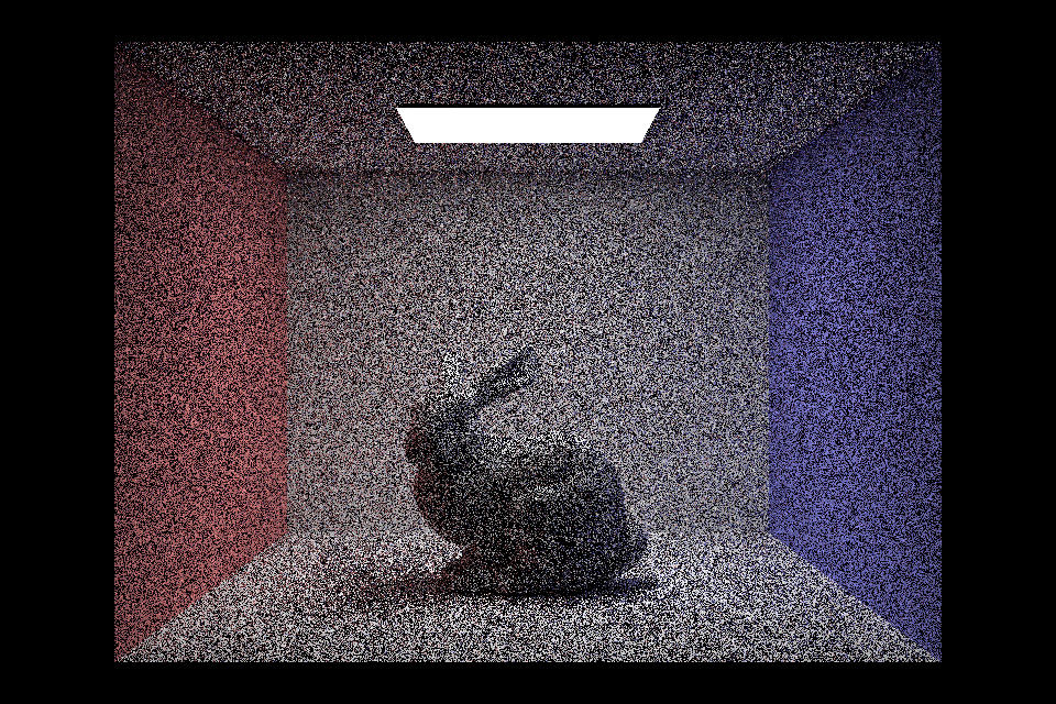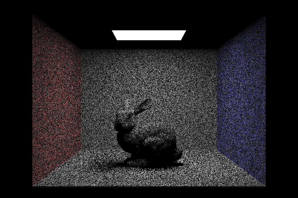 In implementing direct lighting, we first calculate the world coordinates of the hit point, which is where the given ray intersects with the surface primitive. Then a Spectrum varaible is created for L_out, which is the total outgoing radiance at this hit point. For this hit point, all of the SceneLights in the scene are iterated over. For each scene light, if it is a delta light, we only need to sample it once, since the values of the samples are all uniform. Otherwise, we sample ns_area_light number of times for the current scene light. Then for each light sample (1 or more than 1 samples per SceneLight), we call SceneLight::sample_L(...) using the hit point as a parameter. This function returns the incoming radiance, a world space vector from the hit point to the light source, the time-based distance from the hit point to the light source, and the probability density function evaluated at that vector's direction. Then, we check that the z-coordinate of the object space version of the vector from the hit point to the light source is positive; this is to make sure the light source is on the correct side of the surface. If it is, we continue through the loop, otherwise, we skip to the next iteration of SceneLight. Continuing through the loop, we then contruct a shadow ray from the hit point to the light source. This shadow ray originates at the hit point plus an offest of (Epsilon * world space vector from hit point to light source). The offset origin of the shadow ray is included to avoid numerical precision issues: precision issues might cause a shadow ray to start behind its own surface and intersect its own surface, leading to a false intersection. The shadow ray goes from the offset hit point towards the light source, with a maximum time of (distance to light). The purpose of this shadow ray is to check whether there is another object between this hit point and the light source: if there is, then the hit point is a shadow and it's radiance is not included into the running L_out. If the shadow ray does not intersect another object, the current hit point is illuminated by the light source, and we therefore include the Spectrum value returned by isect.bsdf->f(...) in the running L_out. The bsdf at this hit point is calculated using the using the object vectors w_out and w_in. Finally, we have: