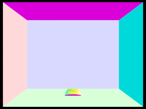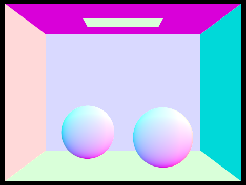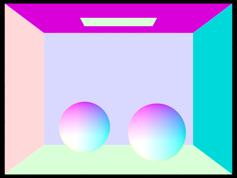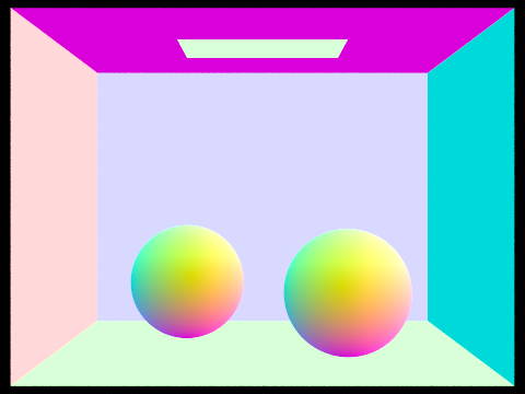 For task 4, in Sphere::test(...), I test to see if a ray intersects with the given Sphere object. The time-based formula of a ray is set to equal the formula of a sphere, and the variable of time, t, is solved for. t is given by evaluating the quadratic formula with a = dot(r.d, r.d); b = 2 * dot(diff, r.d); and c = dot(diff, diff) - this->r2. The discriminant of the quadratic formula is evaluated first (b^2 - 4ac). If the discriminant is negative, there is no intersection and false is returned. Otherwise, one or two solutions exists (if discriminant == 0 or discriminant > 0 respectively). The solutions to the quadratic formula are evaluated fully. The two time solutions are swapped such that t1 is always smaller than t2. Given that there are time solutions to the intersection, in Sphere::intersect(...) we then check to make sure both intersection times are within bounds. If not, false is returned. If it is within bounds, true is returned. If an Intersection pointer was passed in, its values are updated: time, primitive, normal, and bsdf. The normal is the unit vector pointing from the sphere's center to the first intersection point. At first, I had some errors in calculating the normal vector's direction correctly.