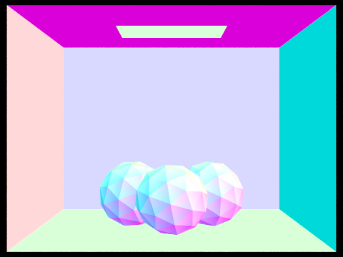 For the BVHAccel::intersect(...), this function is also recursive. First, the ray is checked to see if it intersects with the bounding box of this node, using BBox::intersect(...). If it does not, immediately return. Otherwise, check if the current node is a leaf node. If it is a leaf node, iterate through this node's vector of primitives, and find the intersection with the lowest intersection time. (That is, set the passed in *i to have the data of the Intersection tempI with smallest tempI.t of all the primitives.) After *i is updated with the data of the shortest Intersection time, true is returned. False is returned if none of the primitives are actually intersected. The ray's min_t and max_t values, and total_isects, are set appropriately. Otherwise if it is not a leaf node, then we recurse by calling BVHAccel::intersect(...) on the left AND the right child of this node. A bug arose here, which is shown in the first picture below: my furthest away intersections were being rendered in front of my closest intersections. This bug is because I passed in the same Intersection *i pointer into both recursive calls, causing the second recursive call to overwrite *i of the first recursive call. The fix was to have a temporary Intersection tempI. I pass the reference of tempI into BVHAccel::intersect(...), and then only set the data of Intersection *i to have the data of tempI if (tempI.t < i->t). That is, only update i after each recursive call if the new Intersection tempI has a shorter time than the current i. If Intersection *i is updated after either recursive call, true is returned; otherwise there was no intersection and false is returned.